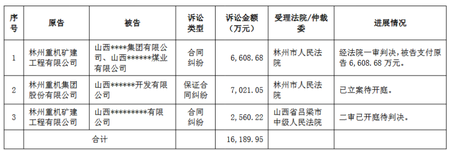 4月17日,林州重机(002535)发布公告,公司及子公司连续12个月累计发生的诉讼、仲裁事项金额合计1.62亿元。具体情况如下: