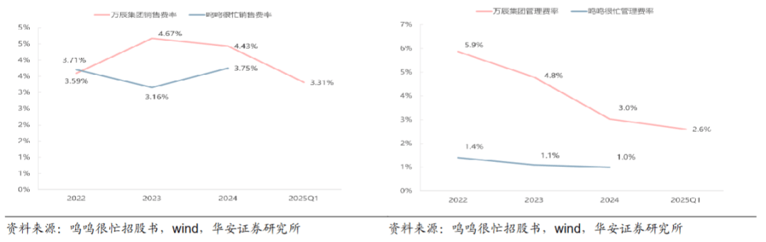 华安证券数据显示,其中销售费率始终维持在高位:2023/2024年为4.4%/4.7%。尤其是2024年,业务拓展费用同比增长3843%,达到3.3亿元,几乎全部用于补贴新门店开业,以追赶“鸣鸣很忙”在门店数量上的优势。