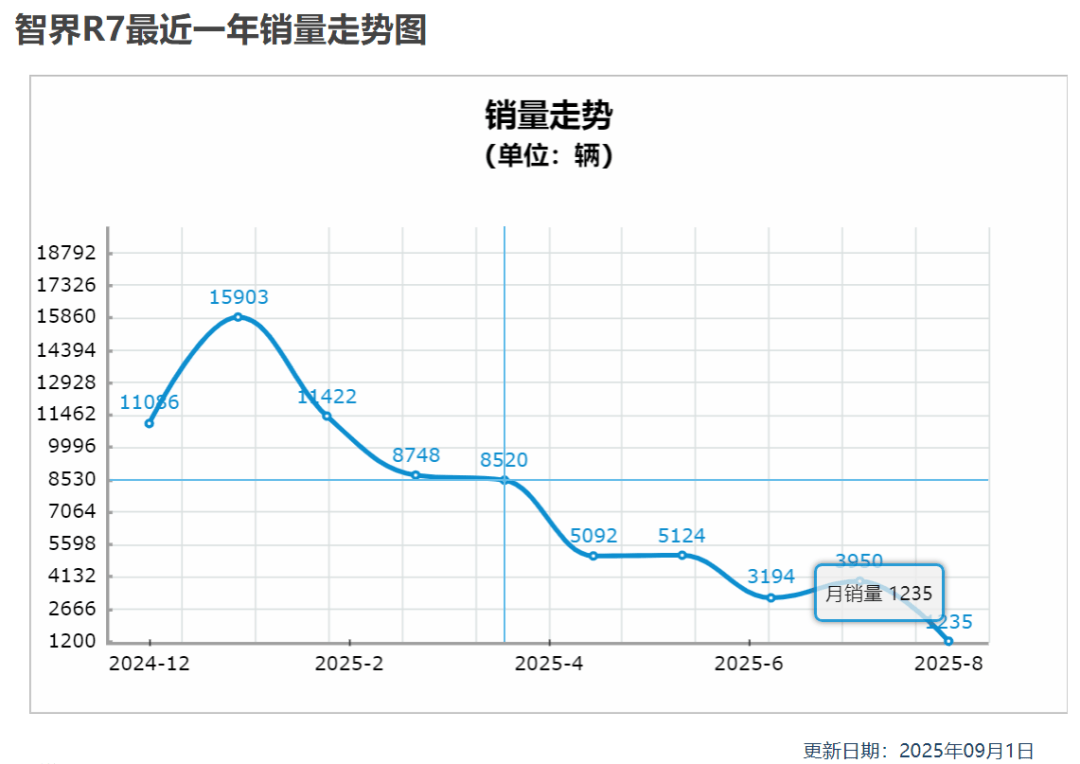 今年以来,智界车型销量略显低迷,7月智界S7销量730辆,去年同期为1541辆;智界R7销量从年初的破万辆,降至今年8月的1235辆。
