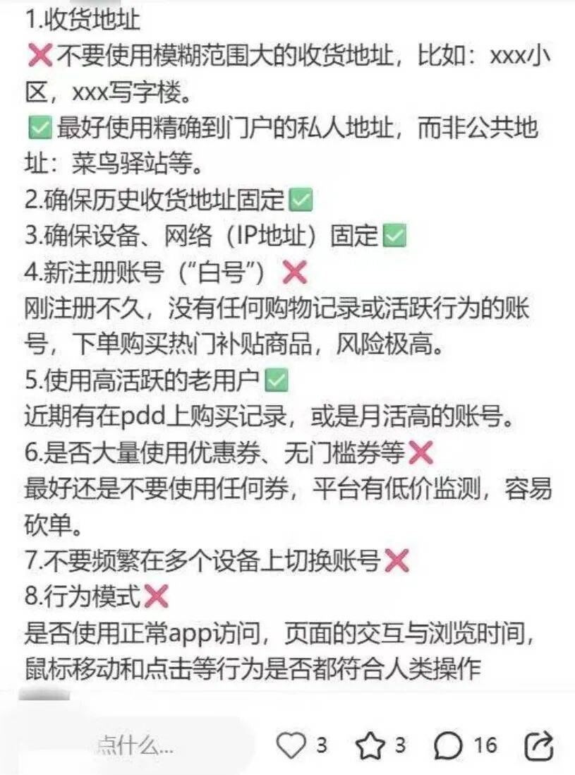 如何使用拼多多百亿补贴成功购买苹果新机,几乎已经成为了社交平台的某种“规则怪谈”。在消费者总结的“防砍单教程”中,可以看到从收货信息,到IP地址,再到日常操作的行为模式,每个购物细节都需要谨慎操作,即使这样也无法保证成功购买,只能降低被砍单的概率。