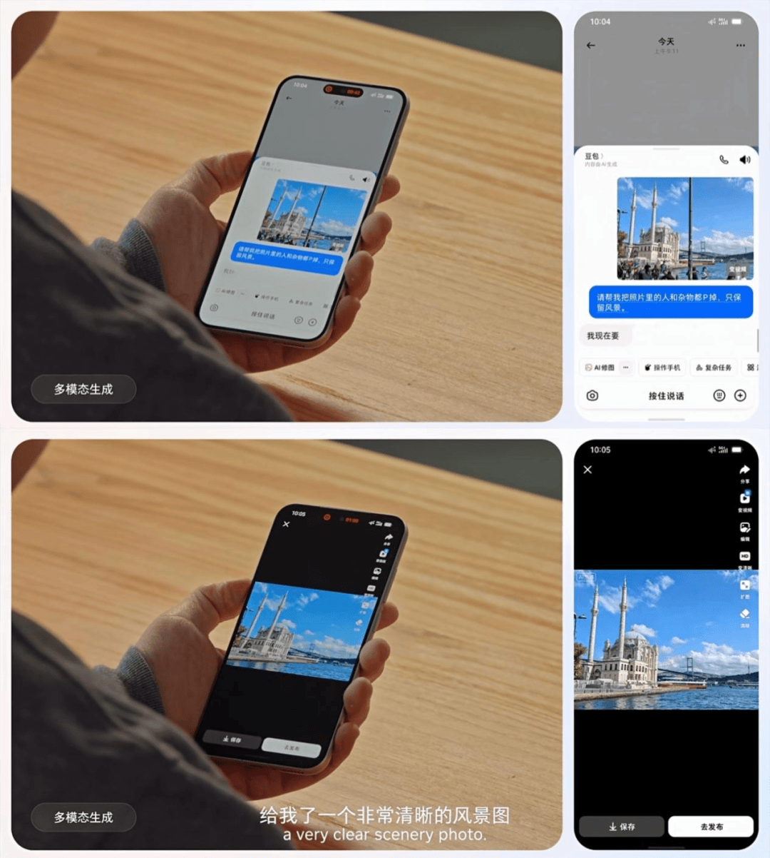 再如图片处理,用户说“把这张照片里的人去掉”“把背景清理一下”,助手可以自动识别目标区域、调用图像编辑工具并完成操作,无需用户打开App逐步执行。