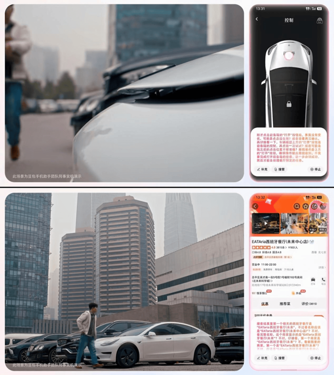 甚至在更复杂的跨场景链路中,豆包也游刃有余。用户可一次性发出多个指令,如:“订阅这个播客的更新并加入播放列表 → 打开特斯拉前备箱 → 订一个今晚八点半的餐厅”,助手将依次在对应App中完成操作,串联起本地应用与线下行为。