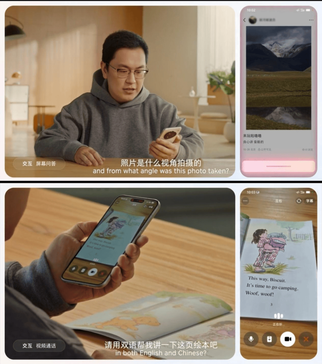 用户无需复制内容或切换App,在任意界面都可以直接发起询问;屏幕内容会被即时理解,例如对照片提问“这个景点在哪”“是从什么视角拍的”,助手直接返回信息;原豆包生态中的语音通话、视频通话、屏幕共享等能力被系统级集成,仅需双击AI键即可进入实时对话。