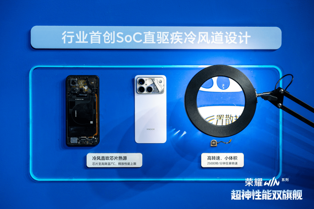 而荣耀WIN的直驱风冷系统再度做出不同于行业的选择——采用微型化、每分钟25000转的东风涡轮风扇,再让风道直接对准主板上发热“元凶”芯片区。