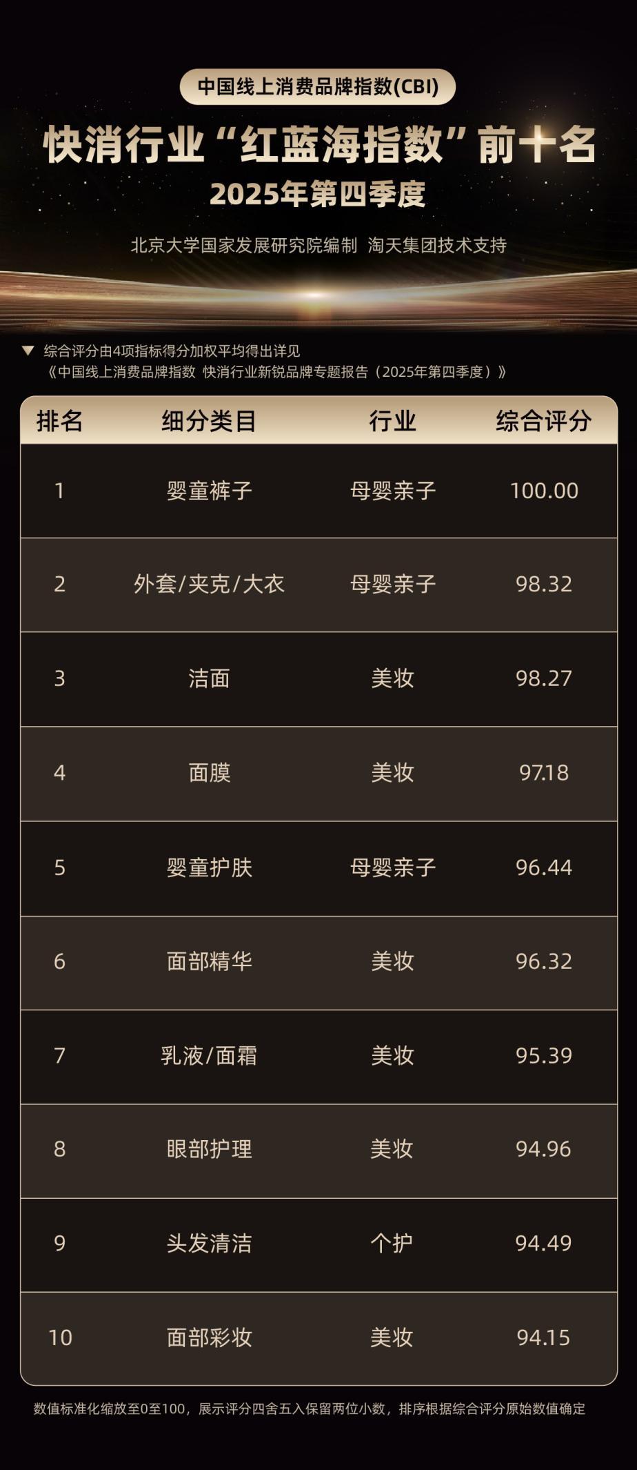 近期,北京大学国家发展研究院依托淘宝天猫平台2025年第四季度的真实消费行为数据,发布了最新一期“快消行业新锐品牌榜”。花知晓、HBN、Off&Relax、至本、Fan Beauty Diary位列榜单前五名,BeBeBus成为母婴亲子行业第一,绽家成为家清行业第一。它们没有讲颠覆性技术的故事,而是靠着在成分、剂型、场景细分上下功夫,去换来用户的持续复购。