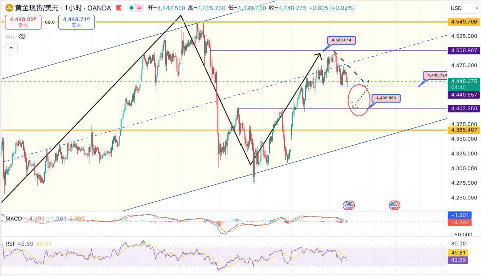亚盘金价自4500高点回落后持续低迷,亚欧盘创出的三个低点均在4440一线,此前我们在图中用「点虚线」描绘了潜在的下行空间,从4小时辅助指标的弱势表现来看,价格有较大概率会进一步下行至4402一线(图虚线箭头)。