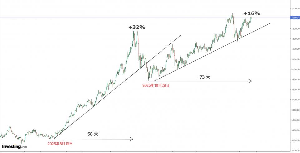 黄金价格在 8 月 19 日至 10 月 17 日的 58 天内上涨了 32%,但自 2025 年 10 月 28 日的低点以来,在过去的 73 天里仅上涨了 16%。
