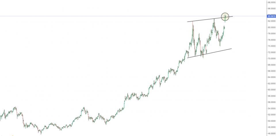 白银价格目前已稳居 80 美元以上。图表中可以看到价格正在试图突破长达16天的盘整区间!