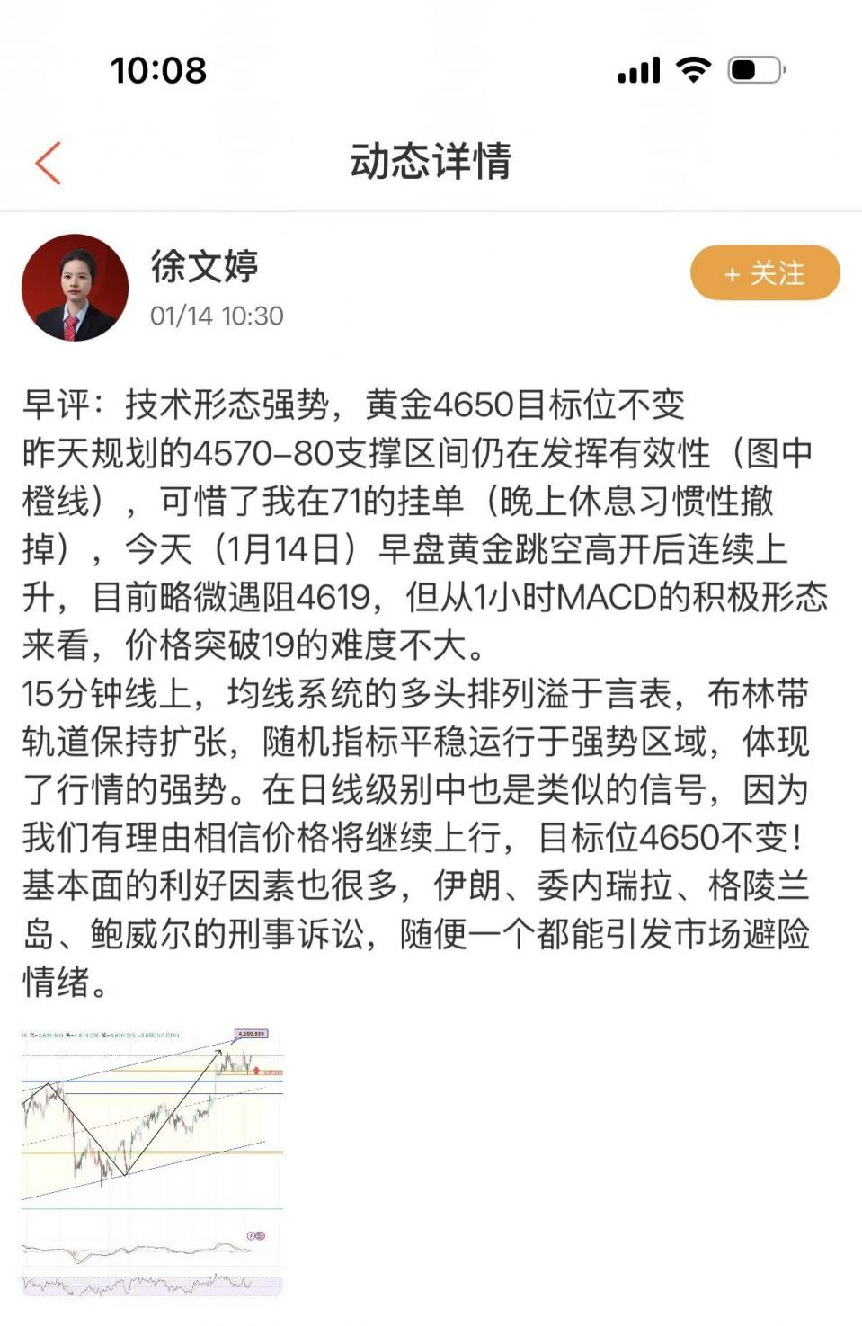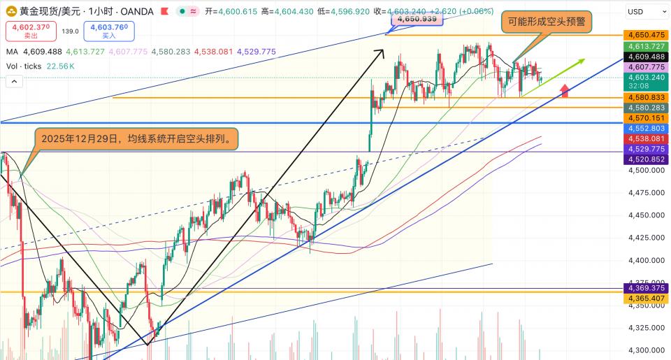 因白宫对于伊朗和鲍威尔的态度有所缓和,打压了一些避险需求,周四金价小跌10美金至4616美元/盎司。经过隔夜的调整,黄金顺利完成了反弹动作,尽管这一动作在当天(1月15日)已经出现了四次,近期几次的反弹起始位均在4570-81区间(图1—本周三分析),算得上是“久经考验”的有效支撑。