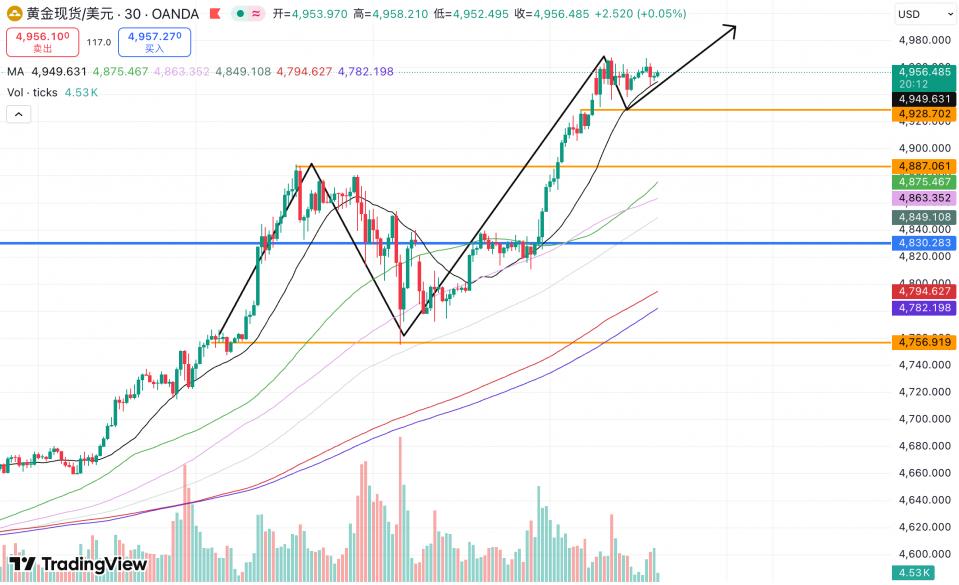 下午的策略是在4900-4910美元建立多头头寸,目标价位为5000-5100美元。与此同时,超短线的空头机会我们也会把握(早上已有战绩)。当然,需要严格风控,毕竟趋势还是上涨。