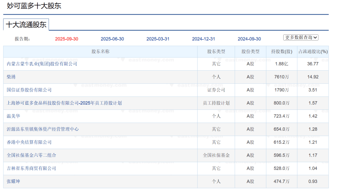蒙牛对妙可蓝多的布局始于2020年,通过增发斥资不超过30亿元成为控股股东,此后持续增持巩固地位。截至2025年三季度,蒙牛持股比例已达36.77%,而柴琇持股14.92%,作为第二大股东,股权差距早已决定了话语权的失衡。