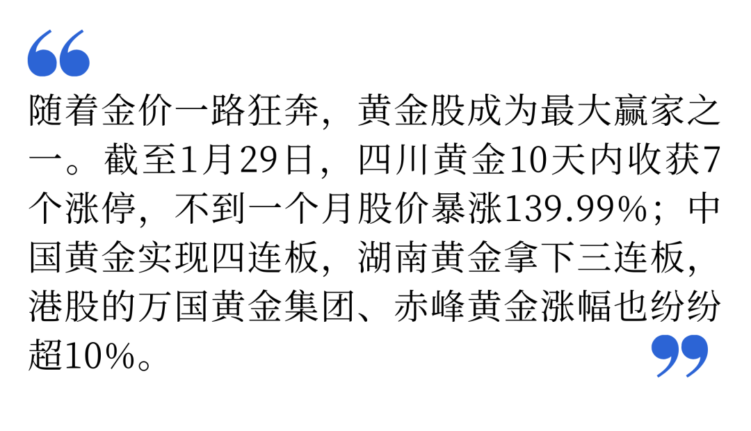 随着金价一路狂奔,黄金股成为最大赢家之一。截至1月29日,四川黄金10天内收获7个涨停,不到一个月股价暴涨139.99%;中国黄金实现四连板,湖南黄金拿下三连板,港股的万国黄金集团、赤峰黄金涨幅也纷纷超10%。与此同时,已披露2025年业绩预告的黄金股清一色预喜,净利润涨幅最高可达90%。