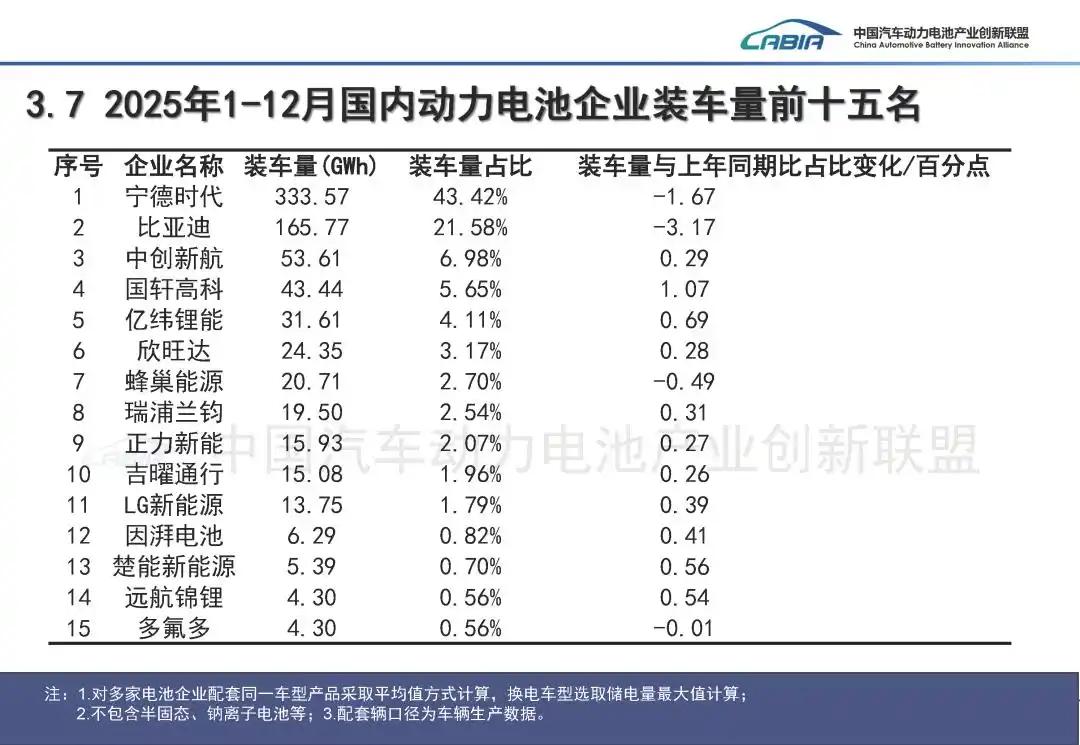 然而,尽管车企自研电池的意愿强烈,但现实往往很骨感。根据中国汽车动力电池产业创新联盟统计,2025年宁德时代国内动力电池装机量市占率43.42%,仍稳居龙头地位,远远超出第二名比亚迪的21.58%。车企自研电池势力中,只有吉利系吉曜通行、广汽系因湃电池跻身TOP15,合计市占率仅2.78%。