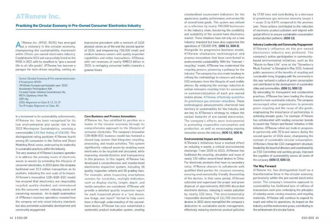 2024年是联合国全球契约组织提出ESG (环境、社会和治理)理念和原则的二十周年。值此之际,联合国全球契约组织发起了ESG+20系列活动,《“二十年二十佳 ”在华企业可持续发展案例报告》的发布是ESG+20系列活动的重要组成。