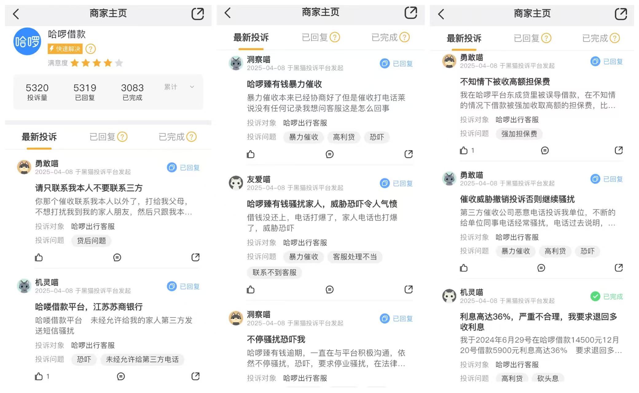 在暴力催收方面,有用户反映,在逾期后,哈啰合作的催收机构会联系其亲友进行催收,甚至还收到了标明“人民法院调解平台”的短信。黑猫投诉平台上,截至4月15日,哈啰借款的累计投诉量达5320条,主要涉及违规收取担保费/服务费、暴力催收、高额利息、骚扰电话等问题。