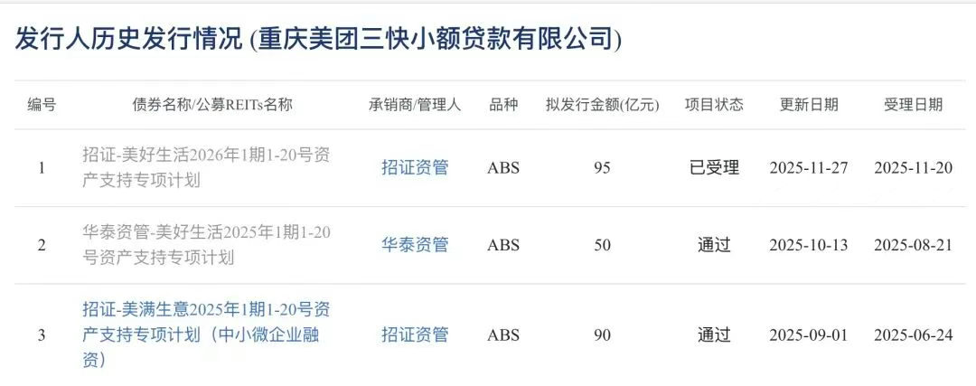 尽管业绩波动巨大,但美团三快小贷的融资能力却极强。据公开信息,自2019年以来,美团三快小贷共发行129单资产证券化产品(ABS及ABN),总发行金额达1255亿元。其中,2025年全年发行25单,金额达268亿元,去年11月更有单笔95亿元的ABS获受理。这种低成本、大规模的融资为其贷款业务提供了充足的资金储备,但也增加了杠杆风险。