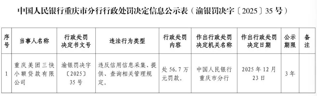 2025年12月31日,中国人民银行重庆市分行官网显示,对重庆美团三快小额贷款有限公司(简称“美团三快小贷”)处以56.7万元罚款,违法行为类型为“违反信用信息采集、提供、查询相关管理规定”,作出行政处罚决定日期为2025年12月23日,公示期限3年。