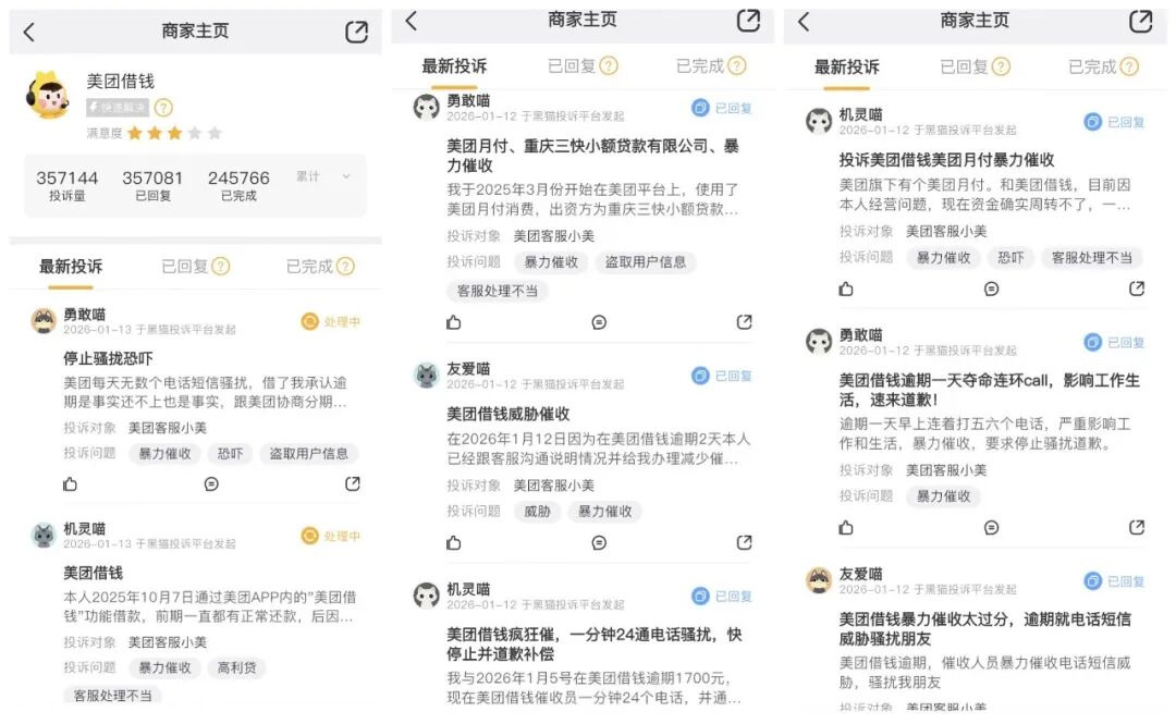 然而,与强劲发展势头形成鲜明对比的是美团金融居高不下的客诉量。例如,截至2026年1月13日,在黑猫投诉平台上,与“美团借钱”相关的投诉累计已超过35万条,还曾多次位列黑猫投诉一周投诉飙升榜“金融科技”板块第一位。