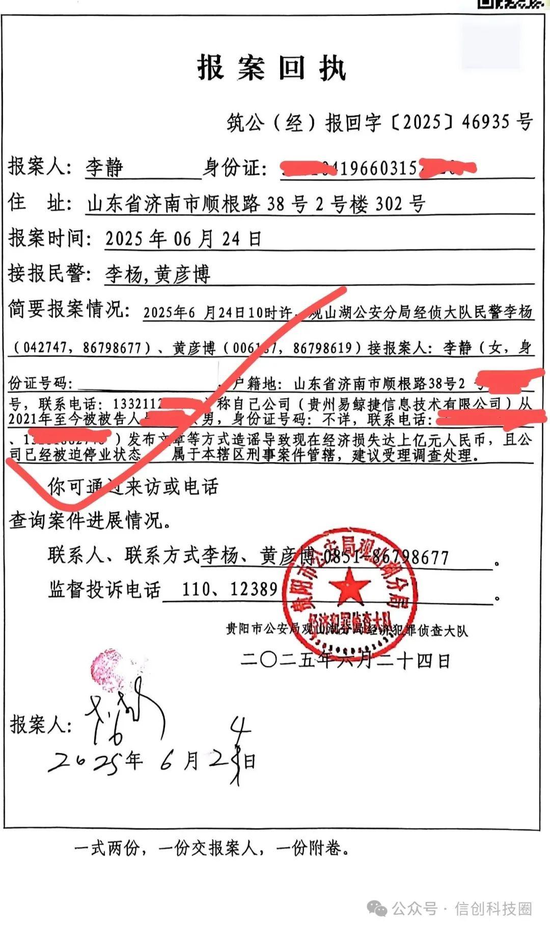 想不到的是,面对“人去楼空”现实和“被强执”的证据,贵阳公安局观山湖区分局经侦大队在2025年6月24日,竟然为贵州易鲸捷实控人李静出具了“建议受理调查处理”的报案回执。