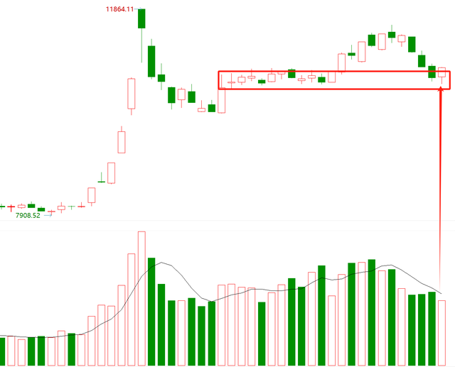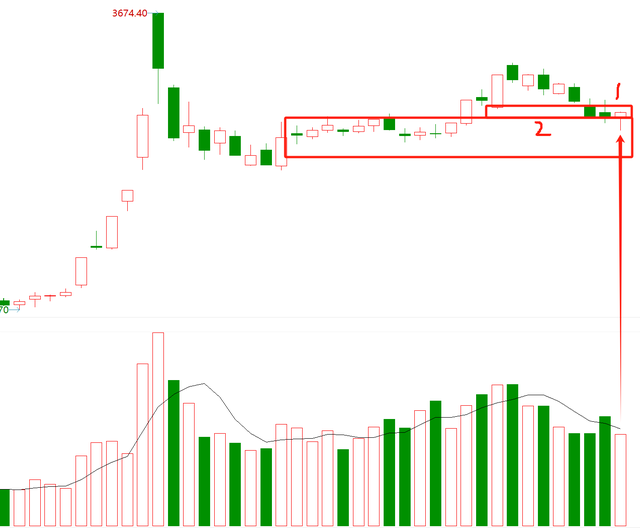也就是说,下图②这个区间顶部,是多头好不容易突破的阵地,现在空头打到这个地方,多头的阵地快守不住了,所以多头现在在死守这个阵地。