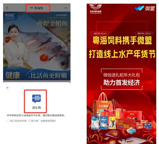 微盟集团是一家致力于为企业提供云端商业及营销解决方案的公司,是腾讯的重要合作伙伴,其小程序率先接入微信小店,支持商家参与微信电商生态。12月25日,粤海饲料携手微盟共同推出了“线上水产年货节”活动,用户可通过微信直接向亲友赠送“蛇年金鲳大礼包”。