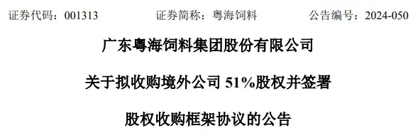 根据公告显示,粤海饲料正在筹备收购I&V Bio Asia Co.,Ltd.51%股权,已签署股权收购框架协议。