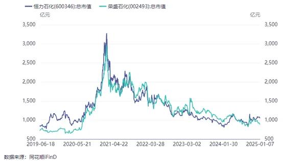 近几年,石油化工行业景气度大幅回落。荣盛石化(002493)和恒力石化(600346)是中国石油化工两大民营龙头企业,2021年初,二者市值曾分别高达2900亿+、3200亿+,盛极一时。然而如今,均已跌至1000亿上下。短短几年,几千亿烟消云散。