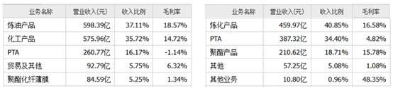 荣盛石化和恒力石化主要产品包括炼油产品、化工产品、PTA(聚酯的直接上游原料)、聚酯产品以及其他等几大类。横向比较来看,除炼油产品外,荣盛石化其他产品毛利率均不占优势。尤其是PTA,毛利率甚至是负的。