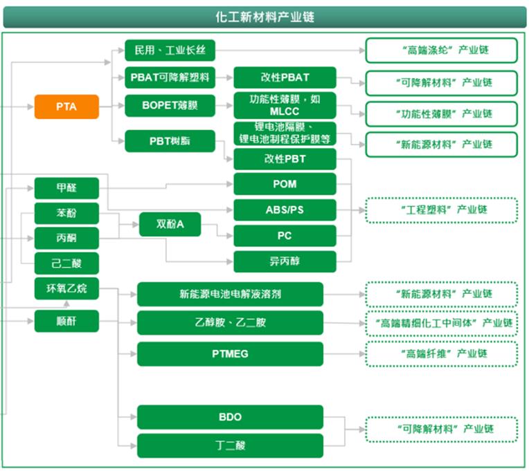 不过,新能源、新材料市场,仍然存在结构性机会。比如,PTA下游可用在高端涤纶、可降解材料、功能性薄膜、新能源材料等产业链。这也是近年来,恒力石化、荣盛石化都在加速发展的领域。