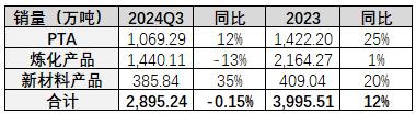 归根结底,油炼万物的属性就已经决定了,这是一个与整体经济水平、消费水平息息相关的行业。2024年前三季度,恒力石化PTA、炼化产品、新材料产品累计销量2,895.24万吨,同比增长-0.15%。其中,炼化产品销量已同比下降13%,市场环境可见一斑。