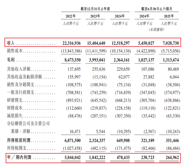 尽管如此,公司近年业绩明显承压。《招股说明书》显示,2022至2025年6月底(以下简称:报告期),天赐材料的营收分别为223.17亿元、154.05亿元、125.18亿元和70.29亿元,相应的净利润分别为人民币58.44亿元、18.42亿元、4.78亿元和2.65亿元。2024年净利润相较2022年下降91.8%,显示出行业周期性调整带来的盈利压力正持续加剧。