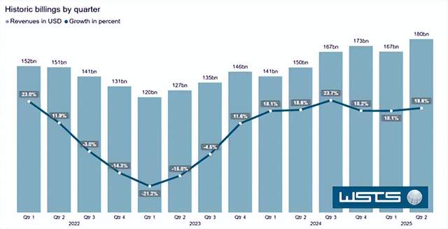 销量增加的结果并不太让人意外,根据WSTS(世界半导体贸易统计组织)的分析数据,2025年上半年全球半导体市场规模达3460亿美元,同比增长18.9%;其中一季度市场规模约1670亿美元,同比增长18.1%;二季度约1800亿美元,同比增长19.6%。