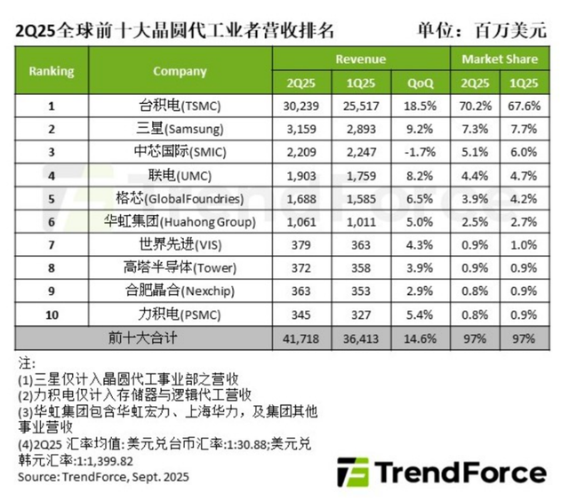 另一方面,排名实现跨越式提升,从2023年Q2的第5位跃升至2025年Q2的第3位,成为全球第三、中国大陆第一的晶圆代工厂商。