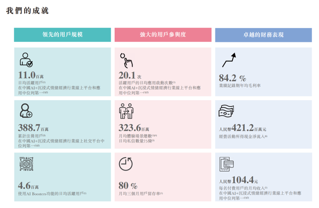 Soul的成功建立在精准捕捉Z世代情感需求的基础上。截至2025年8月31日,平台累计拥有约3.9亿名注册用户,日均活跃用户1100万,其中78.7%为Z世代用户。这些用户表现出极高的黏性,日均使用时长超50分钟,月均三个月留存率高达80%,人均每日发出点对点私信约75条。
