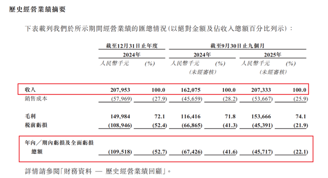 然而,营收增长的阳光并未能驱散利润表上的阴云。2024年,公司净亏损达1.10亿元;2025年前九个月,尽管收入增长,净亏损仍录得4572万元,亏损率为22.1%。这“增收不增利”的困境,是生物科技公司成长初期的普遍规律。