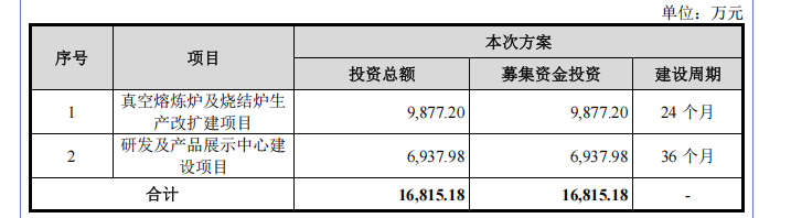 面对订单的爆发式增长,产能瓶颈已成为制约广泰真空持续发展的关键因素。本次 IPO 发行,公司拟募集资金 1.68 亿元,重点投向两大核心项目:真空熔炼炉及烧结炉生产改扩建项目、研发及产品展示中心建设项目。