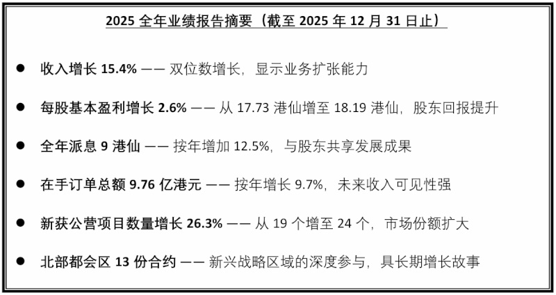 骏杰集团主席及执行董事庄峻岳先生表示: 「2025年是集团战略转型的关键一年。虽然面对充满挑战的市场环境,我们凭借独特的垂直整合业务模式、顶级的专业牌照以及全体员工的不懈努力,成功实现收入稳步增长,并在多个香港重大基建项目中建立了稳固的市场地位。我们对2026年及以后的前景保持乐观。强劲的在手订单为我们提供了稳固的业务基础,尤其是在北部都会区、机场及港铁项目等策略性工程中的深度参与,将为集团带来持续的增长动力。我们将继续深化与主要合作伙伴的联营关系,充分发挥『全结构工种第二组别牌照』的独特优势,并积极把握公私营合作等新业务模式的机遇,致力为股东创造长期可持续的回报。」