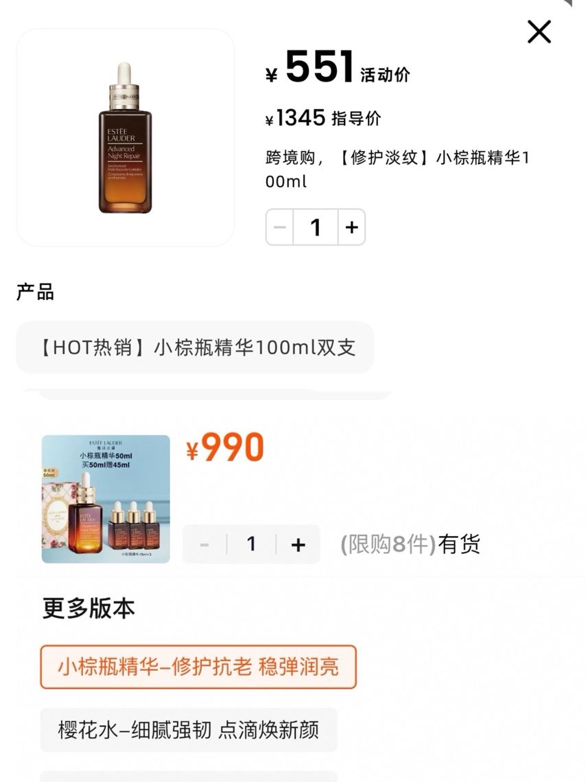源Sight发现,同样是100ml的雅诗兰黛小棕瓶,天猫旗舰店需要990元(50ml赠送45ml),而日上免税仅需要550元,如果去海南现场购买,价格还会更低。