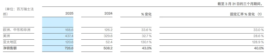 分地区来看,期内欧洲、中东和非洲(EMEA)地区净销售额增长33.6%至1.69亿瑞士法郎,美洲地区增长32.7%至4.38亿瑞士法郎,亚太地区增长130.1%至1.21亿瑞士法郎。