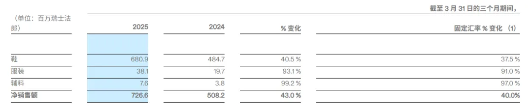 分品类来看,期内昂跑鞋类净销售额增长40.5%至6.81亿瑞士法郎,服装增长93.1%至3810万瑞士法郎,配饰增长99.2%至760万瑞士法郎。