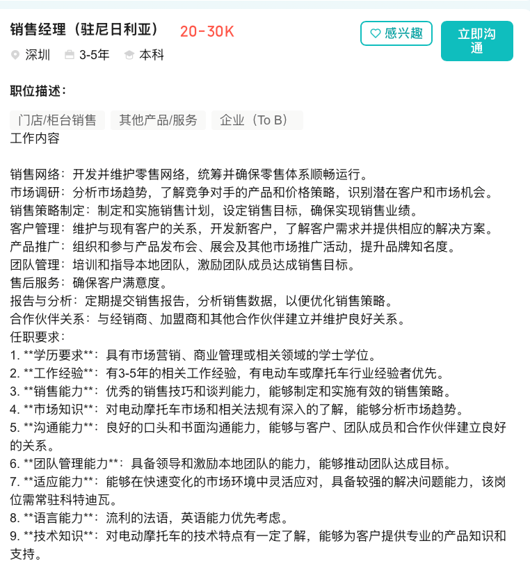 Boss直聘显示,近日传音正在尼日利亚招聘销售经理等岗位,任职要求当中,就有关于“有电动车或摩托车行业经验者优先”“对电动摩托车市场和相关法规有深入的了解,能够分析市场趋势”等描述。而对于这一岗位,传音给出的薪资为2-3万/月。
