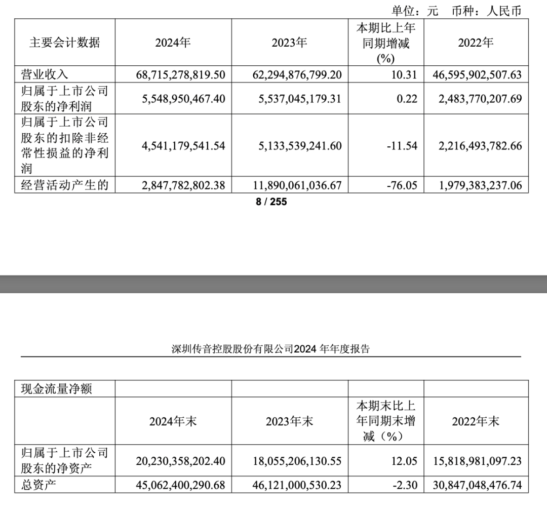 2024年,传音实现营业收入687.15亿元,同比增长10.31%;净利润达55.49亿元,同比微增0.22%;扣非净利润为45.41亿元,同比下降11.54%。
