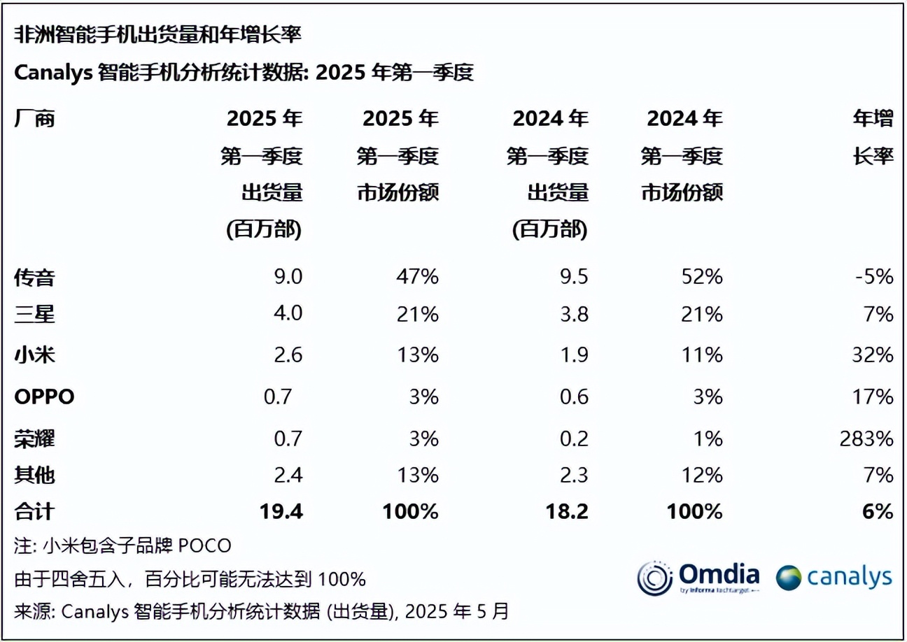 这些本土化的策略收效显著。5月27日, Canalys发布了2025年第一季度非洲地区智能手机市场报告。报告期内,非洲市场智能手机出货量同比增长6%,达到1940万部。