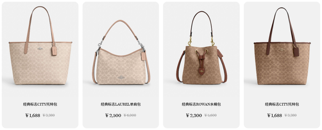 即便是社媒平台上经常被盘点的“Coach里好看又可以背一辈子的包包”,例如经典的City托特包、Laurel单肩包、Rotvan水桶包等,在官网奥莱中已经打出4-5折,最高价不超过2500元;但在其他促销活动和折扣平台上,价格还可下降,甚至来到三位数的中低段。