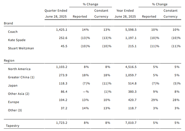 另一边,截至6月28日的2025财年第四季度 ,Coach母公司Tapestry净销售额则同比增长8%至17.2亿美元,全财年增长5%至70.1亿美元。其中,占集团销售额约80%的Coach,第四季度增长13%,全财年增长10%。