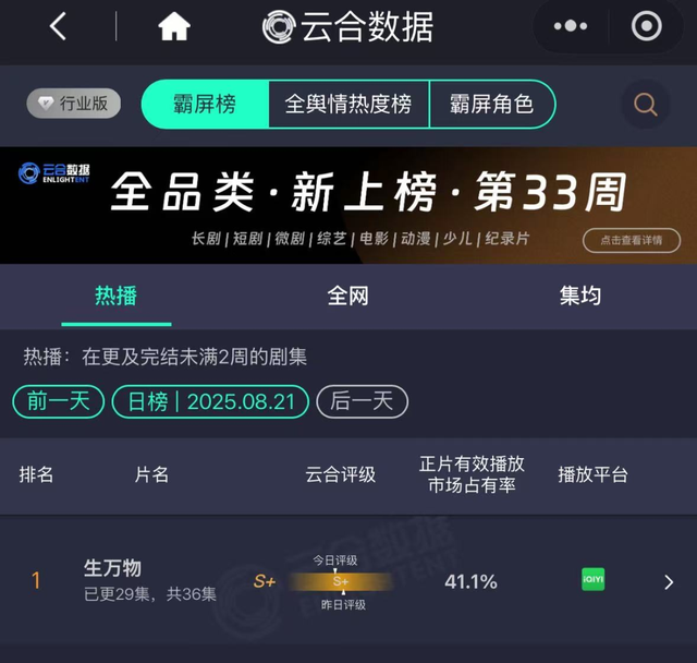 而在剧集市场,夹在短剧和电影之间的长剧集依然有着亮眼的表现,其中尤以爱奇艺推出的《生万物》为代表,以女性和现实题材的差异化内容优势迅速领跑市场——云合数据显示,该剧上线8天,目前有效播放量的市场占有率超过40%,央视收视破4,大比分领先于同期剧目。
