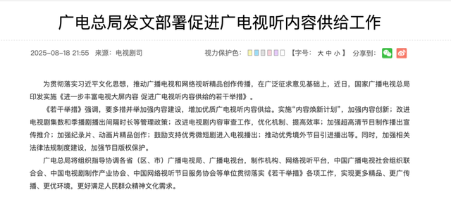 但近年来,影视行业确实处于低潮,在行业的“低调发育”期,近日国家广播电视总局发布了一份新政策——《进一步丰富电视大屏内容促进广电视听内容供给的若干举措》(下文称为“广电21条”)。