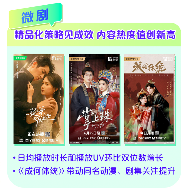 长剧方面,保持高质量内容的输出。除了《万物生》之外,《临江仙》《朝雪录》 两部自制长剧也在爱奇艺热度破万,取得亮眼的表现;微短剧方面,出现了《成何体统》这种动漫IP改编的爆款,自制精品化有了突破。