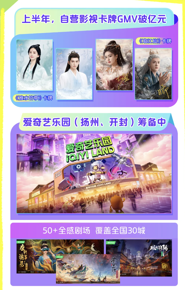 目前爱奇艺的体验业务分为IP消费品和线下体验两个板块。根据第二季度财报,依托丰富的IP储备,爱奇艺上半年自营卡牌业务商品交易总额(GMV)突破亿元,其中《淮水竹亭》和《临江仙》 凭借热门IP的影响力,其卡牌销售额创爱奇艺新高。