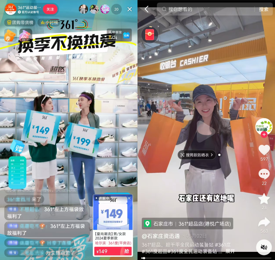 具体到361°这样的传统品牌,它们的特性其实很容易抖音平台的属性结合起来。在抖音,一直会有大量用户在刷到探店、购物等内容,由此也会产生众多未被充分满足的即时消费需求。据源Sight了解,目前每个 361° 超品店每天都会进行一场常态化直播,以对外更新门店促销活动与商品信息。